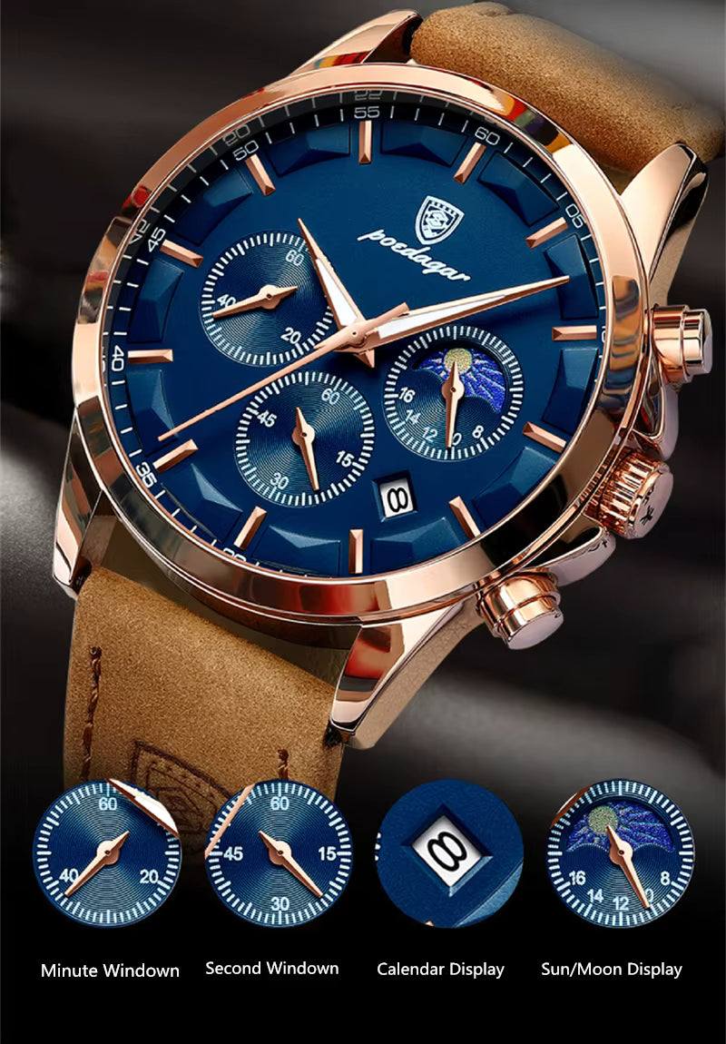 Montre homme luxe à mouvement quartz haute précision, dotée d'un chronographe multifonction, affichage date et semaine, aiguilles lumineuses et bracelet en cuir véritable.