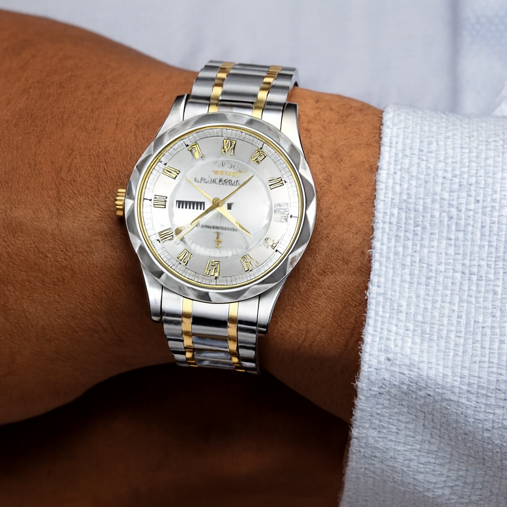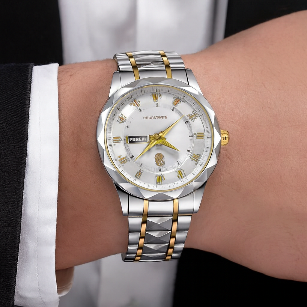 La POEDAGAR™ Prestige Acier inoxydable est conçue pour l'homme qui veut affirmer son statut avec discrétion et assurance. Son design raffiné , inspiré de l'horlogerie de luxe, associe acier inoxydable poli , détails dorés et cadran argenté lumineux , pour un rendu puissant et intemporel.